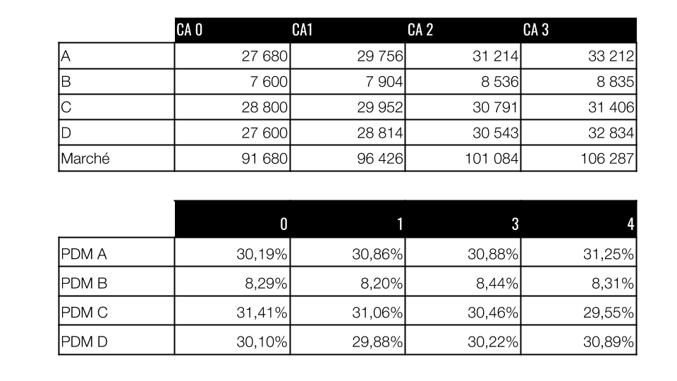 L’entreprise B est la plus petite entreprise du marché, une outsider face à D, leader en 0. Cependant les évolutions contrastées des CA de A, C et D changent la position de chacune des entreprises sur la période.