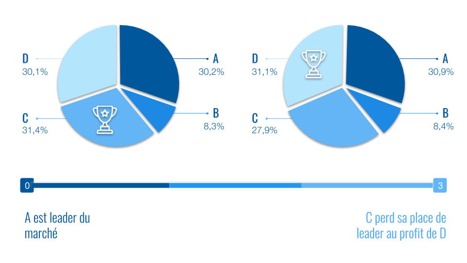 Sur le même exemple, l’entreprise B affiche une croissance supérieure à celle du marché sur la période. Cependant deux de ses concurrents font mieux (A et D). L’évolution moyenne du marché est en effet minorée par la sous performance de l’entreprise C.