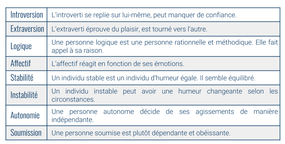 Cette typologie ne résume pas une personnalité. Personne n’est à 100% stable et logique. La personnalité est une combinaison propre à chacun de ces items.