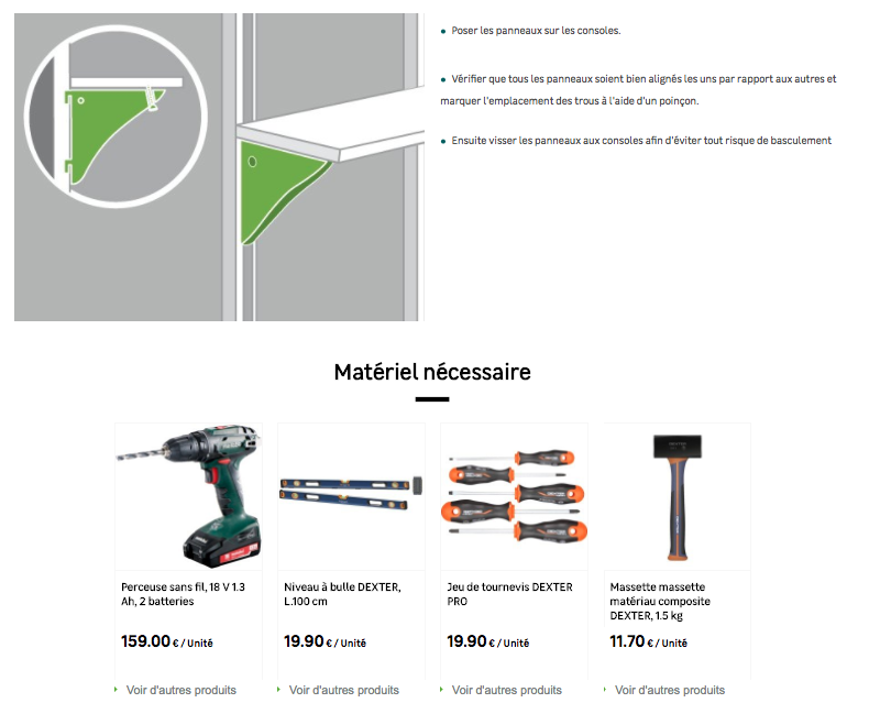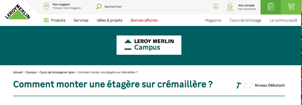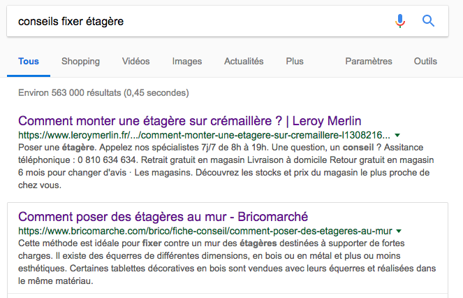 Ci-dessous, la démarche de Leroy Merlin. A partir d’une requête « How to » axée sur le bricolage, le contenu de Leroy Merlin apparaît en haut de recherche, renvoie sur le site dédié. Après un conseil de montage, le visiteur est amené vers la page marchande.