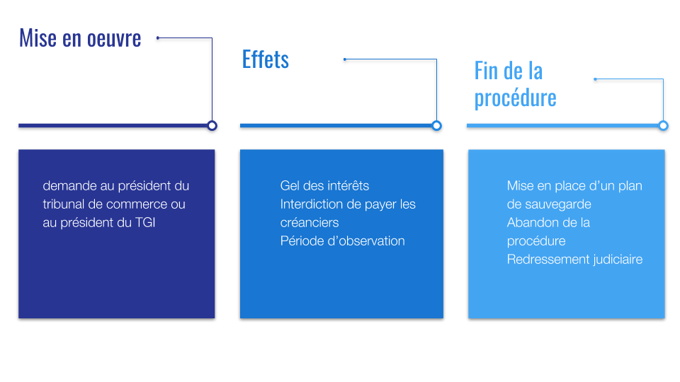 Elle a pour but, par la mise en place d’un plan de sauvegarde, de permettre à l’entreprise de continuer son activité, au besoin en procédant à sa réorganisation, de maintenir l’emploi et d’apurer ses dettes. Le dirigeant est placé sous la surveillance ou assisté par un administrateur judiciaire qui assiste le débiteur, et par un mandataire judiciaire, qui représente les créanciers ; ces deux personnes sont nommées par le tribunal ;