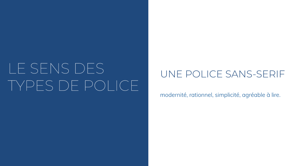 - Une police Sans-serif : modernité, rationnel, simplicité, agréable à lire.
