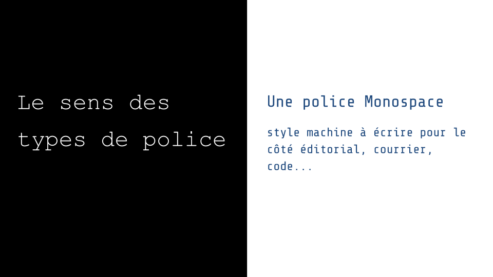 - Une police Monospace : style machine à écrire pour le côté éditorial, courrier, code.