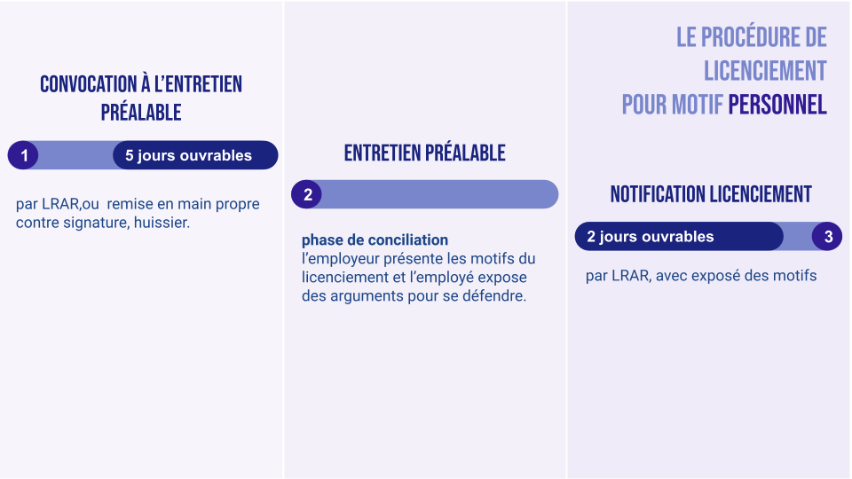 L’employeur doit convoquer le salarié à un entretien préalable. Cette convocation se fait par lettre recommandée avec avis de réception ou remise en main propre contre décharge. Elle doit intervenir au moins cinq jours ouvrables pleins avant l’entretien. La lettre doit préciser que le salarié peut se faire assister par la personne de son choix.