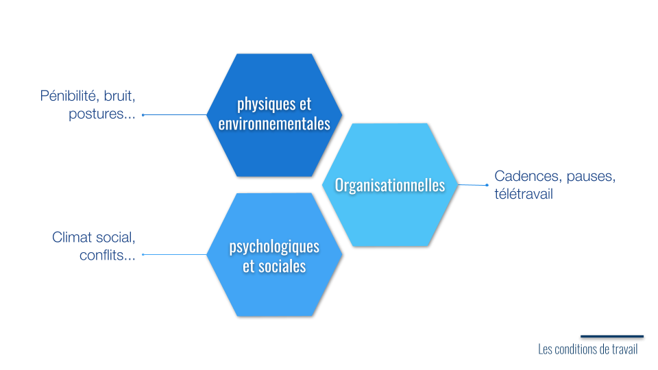 Les conditions de travail déterminent le cadre dans lequel le salarié exerce son activité professionnelle. Il existe trois composantes des conditions de travail :