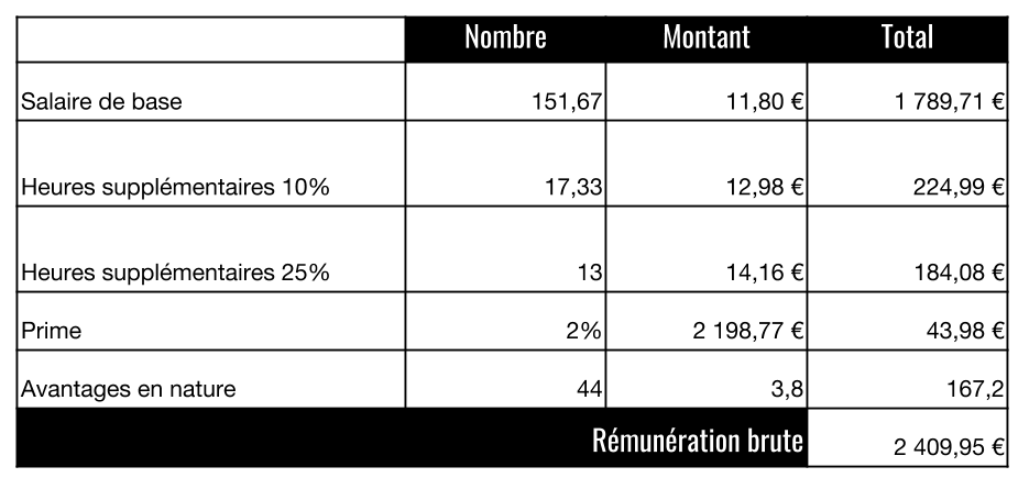 Salaire brut = Salaire de base + Heures supplémentaires + Avantages en nature + Primes