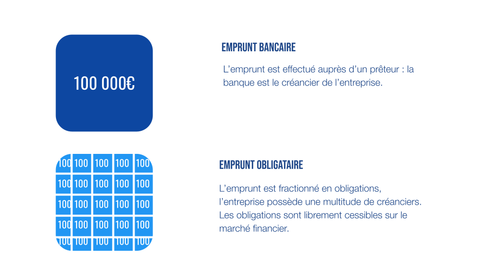 L’emprunt est le fait de contracter une dette à des conditions fixées d’avance (durée, taux d’intérêt, régime fiscal, etc.). Il peut être réalisé auprès d’une banque (dans le cadre d’un crédit), mais aussi sur les marchés financiers par l’émission d’obligations.