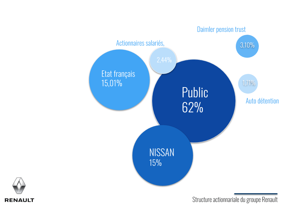 Les grandes entreprises sont souvent détenues par des investisseurs institutionnels (fonds de retraites, compganies d’assurances…) mais aussi par des fonds d’investissements (hedge funds). Blackrock inc. est le principal actionnaire de Total avec 6,5%. Une partie du capital peut être aussi détenue par une entreprise partenaire, comme le cas de Renault avec Nissan.