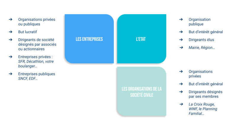 De même, les frontières entre acteurs privés et publics s’estompent. L’Etat n’a pas le monopole de l’intérêt général, de même les entreprises n’ont pas le monopole de la production de biens et de services marchands. On retiendra donc une autre distinction, celle de la finalité des organisations.
