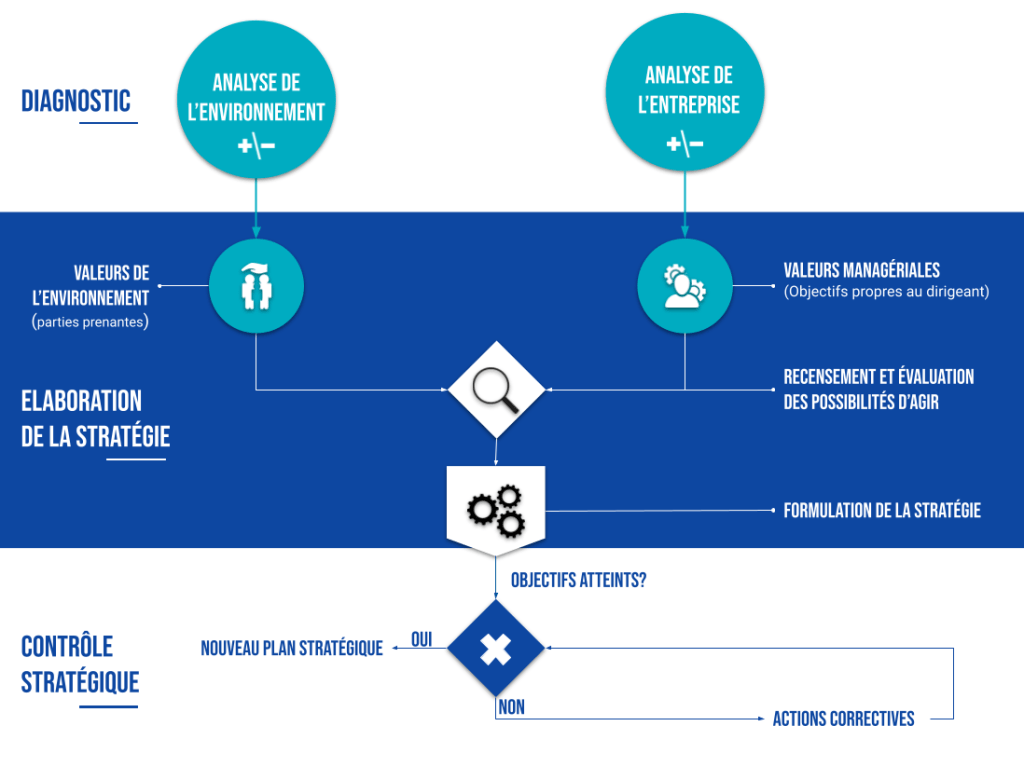 Le processus stratégique des organisations s’organise en trois temps: tout d’abord le diagnostic stratégique, qui porte autant sur les atouts et les faiblesses de l’organisation que sur les opportunités et les menaces de l’environnement. Ce diagnostic permet de formuler une stratégie, seconde étape, qui consiste tout d’abord à sélectionner une solution parmis les différentes possibilités puis à fixer des objectifs et définir des moyens pour y parvenir. Troisième temps, le contrôle stratégique qui surpervise la mise en oeuvre de cette stratégie.