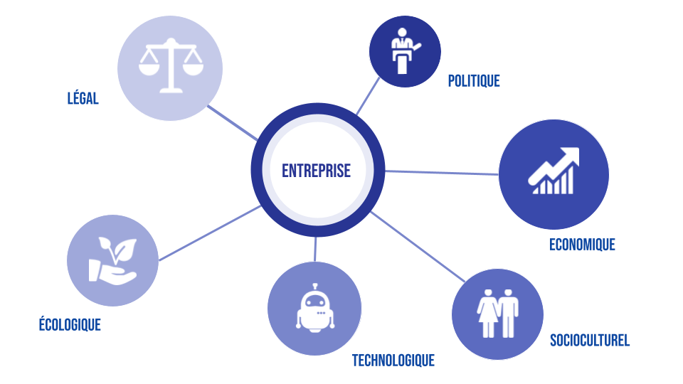 Toute organisation se trouve insérée dans un environnement (ensemble d’acteurs et de faits extérieurs), qui influence toute décision stratégique. Or cet environnement est par nature complexe et ne peut en aucun cas se résumer à l’étude des seules dimensions économiques, comme le marché. D’autres variables sont tout aussi cruciales comme les évolutions technologiques, la réglementation ou les normes écologiques ou encore les nouvelles tendances sociétales, qui peuvent favoriser ou menacer l’activité de l’entreprise.
