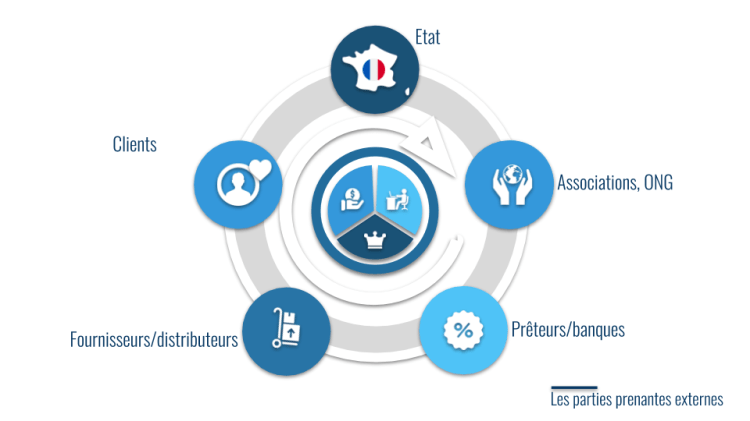Les parties prenantes de l’organisation regroupent l’ensemble de ceux qui participent à sa vie économique (salariés, clients, fournisseurs, actionnaires pour une entreprise), de ceux qui observent l’entreprise (syndicats, ONG), et de ceux qu’elle influence plus ou moins directement (société civile, collectivité locale). Les parties prenantes sont toutes les personnes ayant un intérêt dans les activités de l’entreprise.
