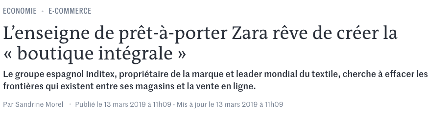 En terme de nouveaux usages, les consommateurs sont clients sont de plus en plus nombreux à se rendre en magasin après avoir fait une présélection sur Internet et les entreprises doivent désormais effacer au maximum les frontières entre la vente en ligne et en boutique. Cette intégration poussée permet ainsi à Zara (groupe inditex) de dévlopper la boutique intégrale : “En magasin, les vendeurs reçoivent une alerte sur leur terminal quand un produit est à préparer pour une commande en ligne. Le RFID permet aussi d’indiquer en temps réel aux vendeurs quel produit, quelle taille et quelle quantité substituer ou réapprovisionner en magasin en fonction des ventes enregistrées. Cela permet également aux designers d’avoir des indications sur les tendances qui triomphent en magasin.“