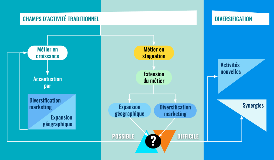 - de répartir les risques sur plusieurs domaines d’activité : si un domaine d’activité est en difficulté, un autre domaine pourra compenser et assurer la pérennité de l’entreprise.