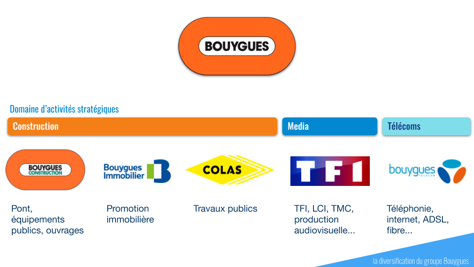 Autre exemple, le groupe Bouygues, spécialisé dans la construction et le BTP, qui s’est ensuite diversifié dans les communications via la chaîne de télévision TF1 et les télécommunications avec Bouygues télécom.