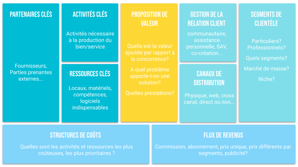 Ce graphique visuel est composé de neuf éléments, répartis en 4 catégories, décrivant la proposition de valeur, l’infrastructure, les clients et les finances d’une entreprise.