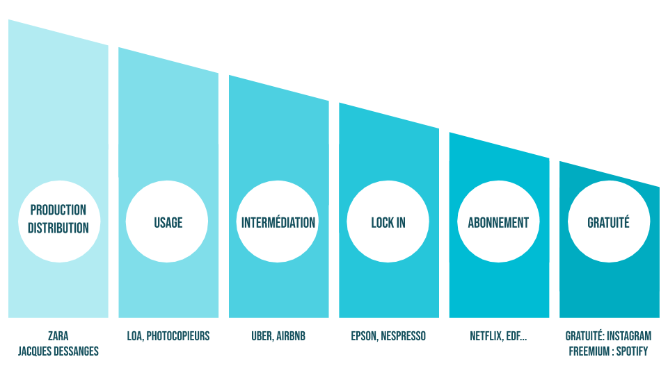 Mais la révolution numérique a permis l’émergence de nouveaux business model, avec des logiques d’intermédiations entre des offreurs et des demandeurs (Airbnb, Blablacar, Le bon coin, les market place d’Amazon ou la FNAC etc) dans une logique d’appariement (favoriser la rencontre) de l’offre et de la demande de biens et service. Le numérique a aussi favorisé l’économie d’usage plutôt que détention, comme le streaming, par lequel le consommateur a accès à un catalogue de biens culturels le temps de son adhésion à un service plutôt que l’achat de ce bien (Spotify au lieu de l’achat d’un disque).