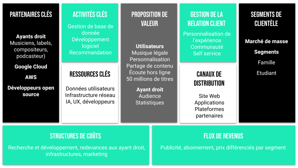 Il ressort de cette grille que les compétences et les savoirs faires de l’organisation sont d’abord technologiques, et que les partenaires sont indispensables à la réalisation de la proposition de valeur, tant pour l’approvisionnement du catalogue que pour la disponibilité du service. De même, les ayant droits sont à la fois partenaires et clients de l’entreprise. La monétisation est variée, mais les charges variables (rémunération des ayants droits) pèsent sur la rentabilité, et que la concurrence directe et indirecte du secteur (Apple Music, Youtube) pèsent sur les dépenses de marketing.