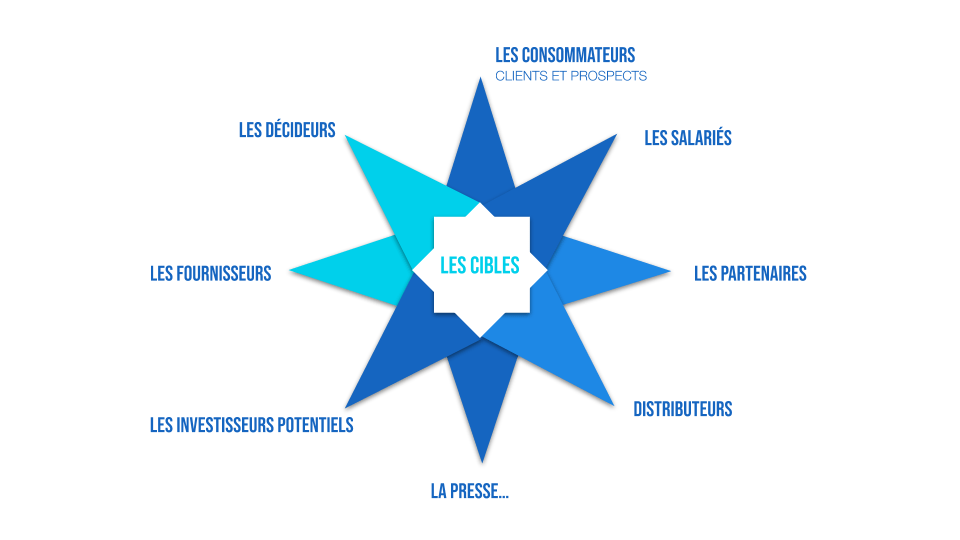La cible (ou le destinataire de la communication) est très diverse, tant sur la nature des cibles, que sur leur nombre, leurs centre d’intérêts et leurs attentes. On peut ainsi citer, pour les principaux