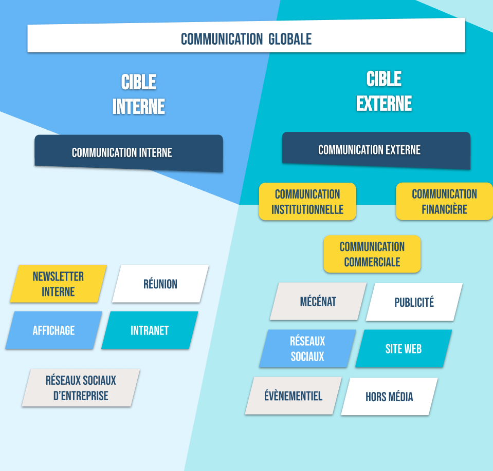 Pour être optimale, la communication d’entreprise doit s’inscrire dans une communication globale, c’est-à-dire que toutes de communications définies doivent être compatibles et cohérentes entre elles. Ces différentes actions doivent avoir le même objectif : doter l’entreprise d’une identité (soit un ensemble de données et de faits conférant un caractère unique à l’entité), reconnaissable et positive par ses différentes cibles.