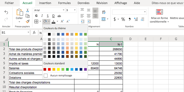 Couleur de fond : sélectionnez la cellule que vous souhaitez habiller, puis cliquez sur l’icône peinture.