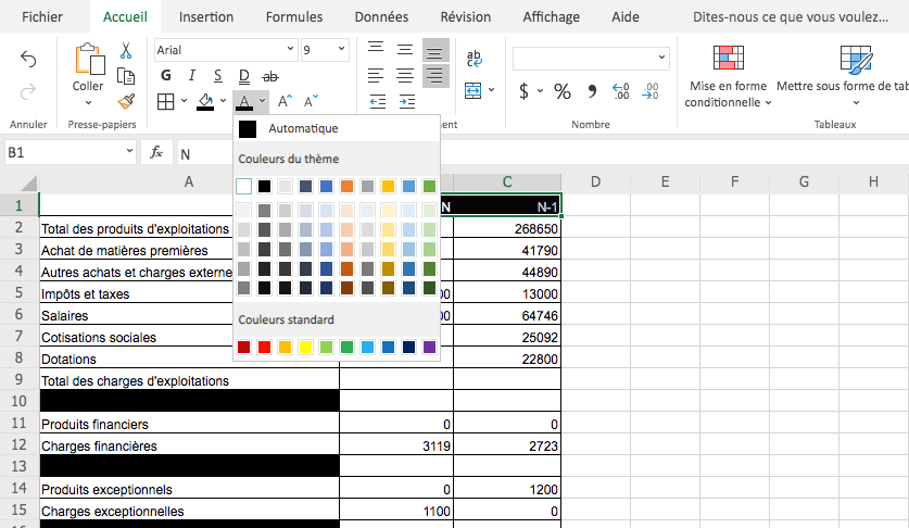 Couleur de police: sélectionnez la cellule (et non pas le texte/valeur à l’intérieur), et paramétrer la couleur en cliquant sur l’icône “A”.