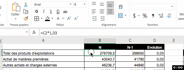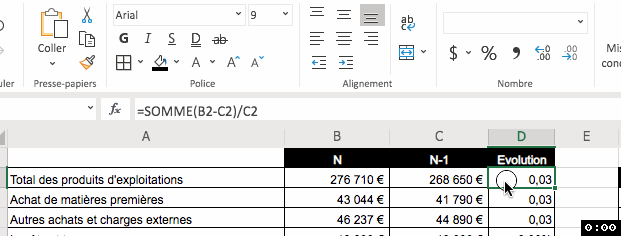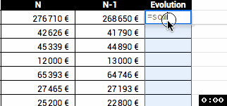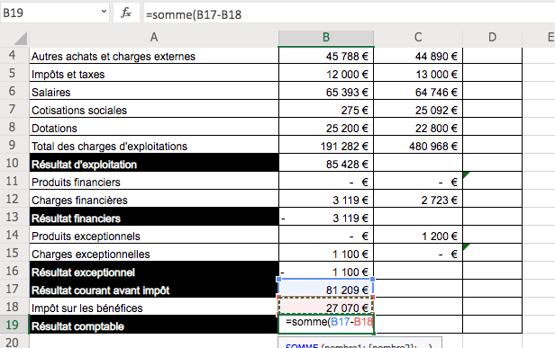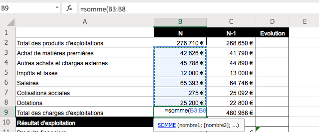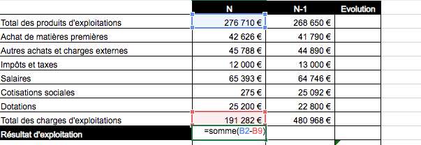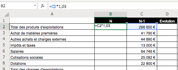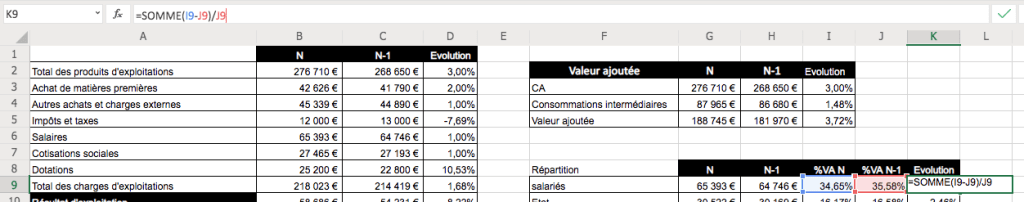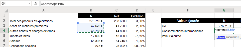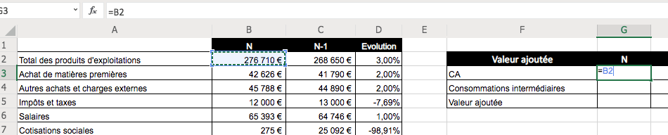 Isolez les valeurs dans un nouveau tableau, et paramétrez vos cellules, en faisant référence au CA d’une part, puis en calculant la somme des achats pour déterminer les consommations intermédiaires.