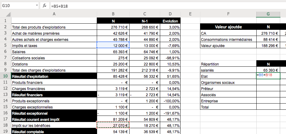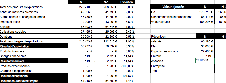Créer un nouveau tableau indiquant les bénéficiaires de la valeur ajoutée en N et N-1, puis exprimez ces montants en pourcentage de la valeur ajoutée, et l’évolution de la part de chacun en pourcentage de la valeur ajoutée.