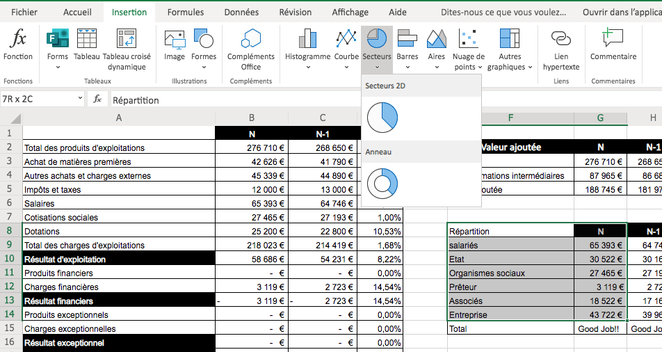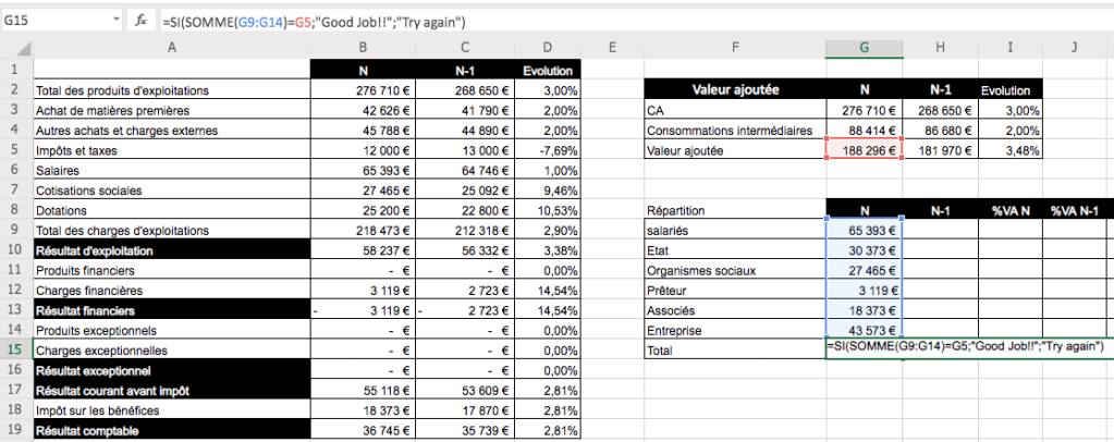 Indiquez une condition dans la case totale. Si la somme des parts en € de chaque bénéficiaire de la valeur ajoutée est correctement effectuée, le total doit être identique à celui de la valeur ajoutée précédement effectué. Soit SI la somme des parts des bénéficiaires en N= la valeur ajoutée en N alors “c’est correct” SINON “vérifiez vos calculs”.