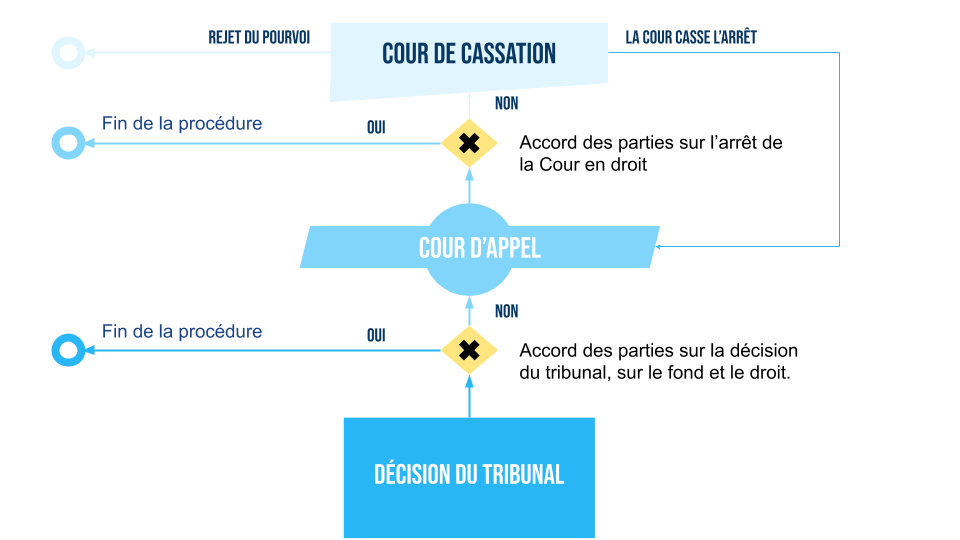 Derniers recours possible, La Cour de Cassation. Il ne s’agit pas ici d’un nouvel appel, la Cour de Cassation ne juge pas sur le fond, c’est-à dire sur les éléments de faits qui ont conduit à la décision de la Cour d’Appel. Son rôle est de vérifier que les règles de droit ont été correctement appliquées par la Cour d’Appel. La Cour de Cassation est donc en réalité le juge des décisions des juges : son rôle est de dire s’ils ont fait une exacte application de la loi au regard des données de fait, déterminées par eux seuls, de l’affaire qui leur était soumise et des questions qui leur étaient posées.