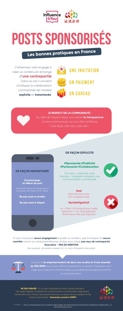 L’influenceur est en théorie avant tout un consommateur qui, par son expérience de consommation, peut procéder à une recommandation. Le recours au placement de produit par les marques posent alors des problèmes éthiques et juridiques s’il n’est pas clairement identifié comme tel. Dès lors qu’un influenceur s’engage à poster un contenu, sous la supervision de la marque, et que cet engagement fait l’objet d’une contrepartie (rémunération, don du produit…) cette pratique ne relève plus d’un simple avis mais d’une publicité, ce qui peut se révéler comme une tromperie du consommateur si ce dernier n’est pas informé dudit placement de produit. Or le cadre législatif du placement de produit sur le web est moins contraignant qu’au cinéma par exemple. La mention de l’existence d’un placement de produit est en théorie obligatoire, Youtube incite ses utilisateurs à le signaler, mais ces dispositions ne sont peu ou pas appliquées dans la pratique, qui reste dominée par les usages existant avant cette régulation. L’ARPP, l’autorité de régulation professionnelle de la publicité, cherche ainsi à limiter cette pratique à la fois pour préserver l’image de la publicité auprès du public et éviter une régulation trop contraignante. Ainsi, l’ARPP préconise pour les “cas où le caractère publicitaire du message ne se manifeste pas clairement (…) d’adjoindre une indication explicite permettant d’identifier la publicité comme telle. Lorsque le message est diffusé au milieu d’informations ou d’articles rédactionnels, il doit être présenté de manière à ce que son caractère publicitaire apparaisse instantanément. Cette indication doit être lisible ou audible, et intelligible.”