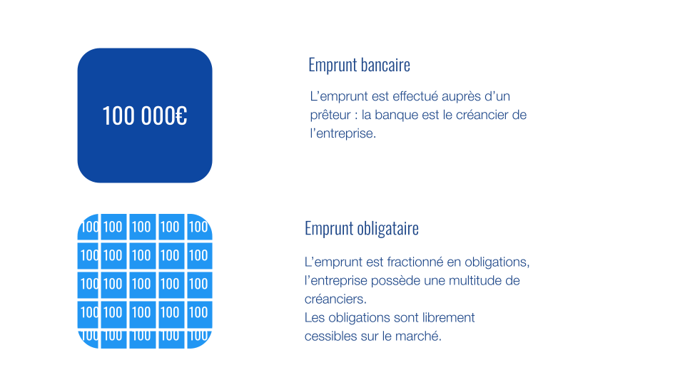 L’emprunt est le fait de contracter une dette à des conditions fixées d’avance (durée, taux d’intérêt, régime fiscal, etc.). Il peut être réalisé auprès d’une banque (dans le cadre d’un crédit), mais aussi sur les marchés financiers par l’émission d’obligations. Les obligations sont des titres de créance représentant chacune une fraction d’un emprunt dit « obligataire ». Les obligations sont émises pour une durée fixée à l’avance (appelée échéance) et donnent droit à une rémunération fixe et certaine (des intérêts appelés coupons).