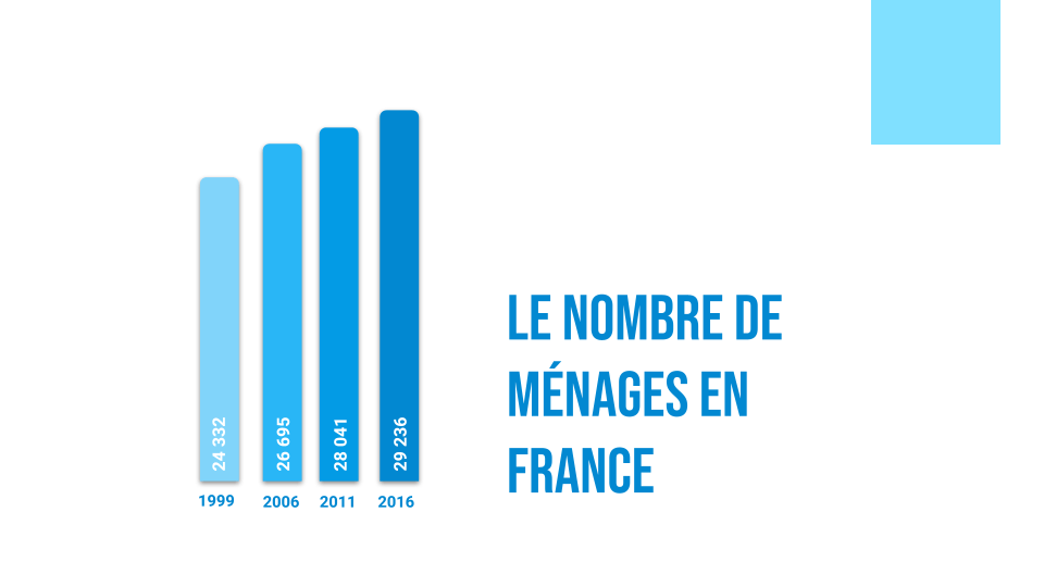 Le nombre de ménages augmente depuis 40 ans mais leur taille diminue régulièrement (moins d’enfants, plus de séparation, moins de cohabitation intergénérationnelle).