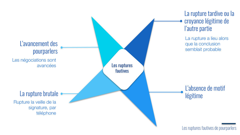 La rupture tardive ou la croyance légitime de l’autre partie : rompre alors que l’autre partie pouvait légitimement croire en la conclusion probable du contrat peut être considéré comme fautif.