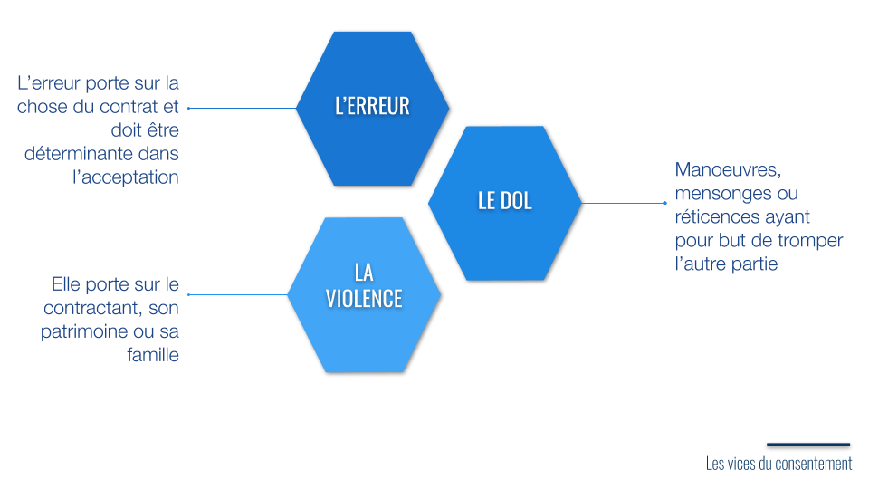 “L’erreur, le dol et la violence vicient le consentement lorsqu’ils sont de telle nature que, sans eux, l’une des parties n’aurait pas contracté ou aurait contracté à des conditions substantiellement différentes.” article 1130 du code civil.