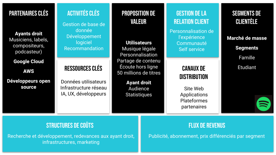 Ci-dessous, le business model de Spotify là aussi sous forme de canva. Les compétences et activités clés de l’activité sont sans rapport avec la production musicale d’oeuvres, mais axée sur l’infrastructure numérique de la plateforme permettant la mise en relation entre les maisons de production musicale et les auditeurs.