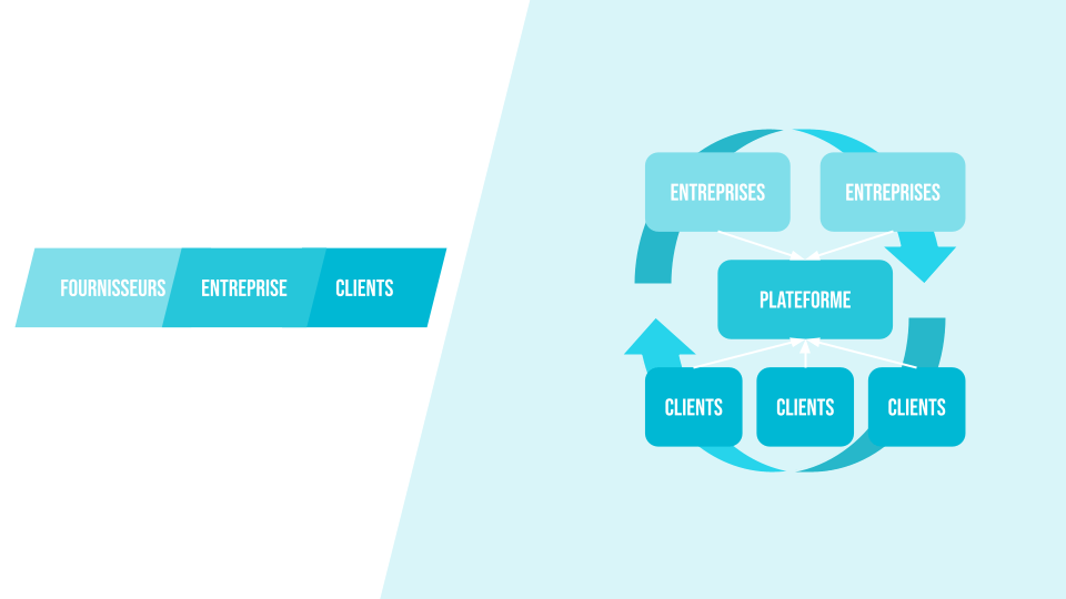 A rebours du modèle traditionnel, la valeur n’est pas apportée par l’entreprise mais par l’écosystème de cette dernière. Un type d’utilisateurs (un hôtel par exemple) crée de la valeur pour un ou d’autres types d’utilisateurs (professionnels ou touristes). La plateforme (ici Booking) facilite les transactions entre les participants.