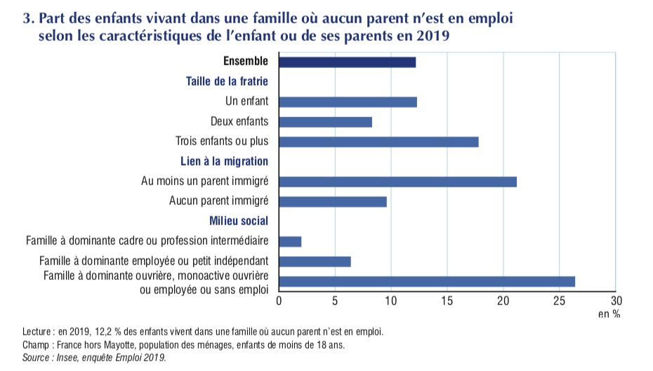 Conséquence de la pauvreté, les enfants pauvres. En France, en 2018, un enfant sur cinq vit dans une famille pauvre. Cette situation a des conséquences sur l’avenir de cette jeunesse, que ce soit en termes d’accès au soin, obésité, réussite scolaire…