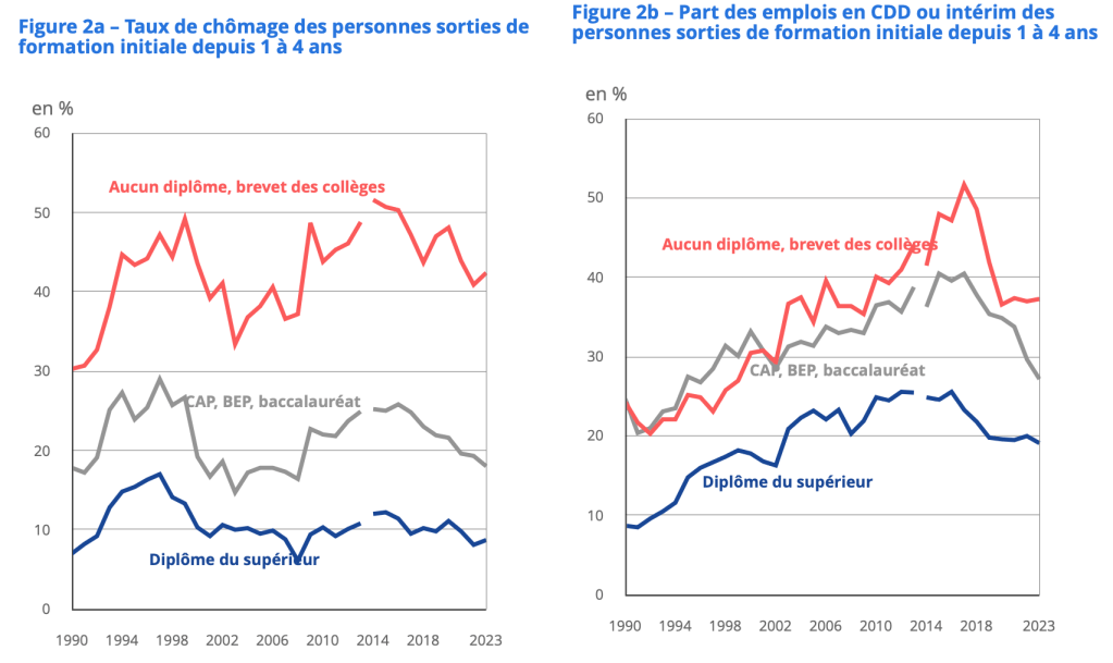 Le diplôme impacte à la fois l’insertion sur le marché du travail et le type d’emploi. Le taux de chômage des non diplômés est ainsi de 42% contre 9% pour les diplômés du supérieur. De même, la probabilité d’être en emploi précaire est trois fois supérieur pour les moins diplômés que ceux de l’enseignement supérieur.