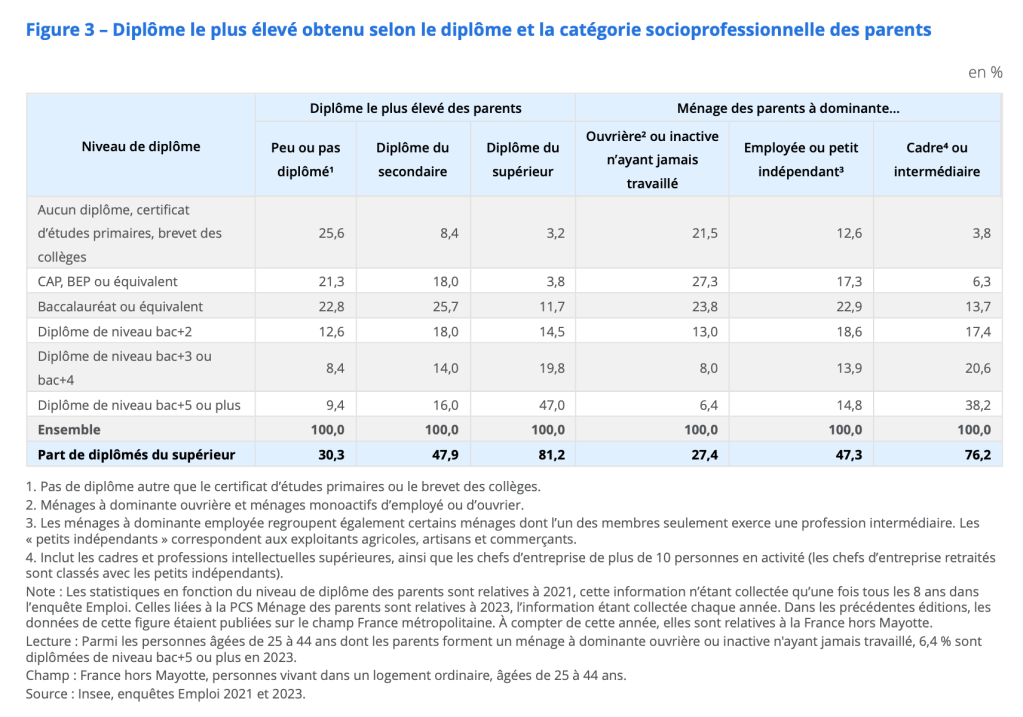 Près d’un enfant de personnes non diplômée sur quatre n’a aucun diplôme, 30% sont diplômés de l’enseignement supérieur dont seulement 9,4% ont un diplôme bac+5. A l’inverse, 38% des enfants de cadre sont diplômés d’un bac +5 contre 3,8% sont sans diplôme.