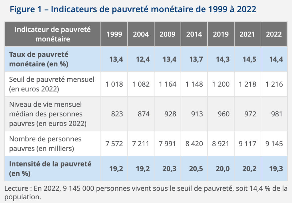 La pauvreté frappe 14,4% de la population française, soit plus de neuf millions d’individus, dont les revenus sont inférieurs à 60% du revenu médian.