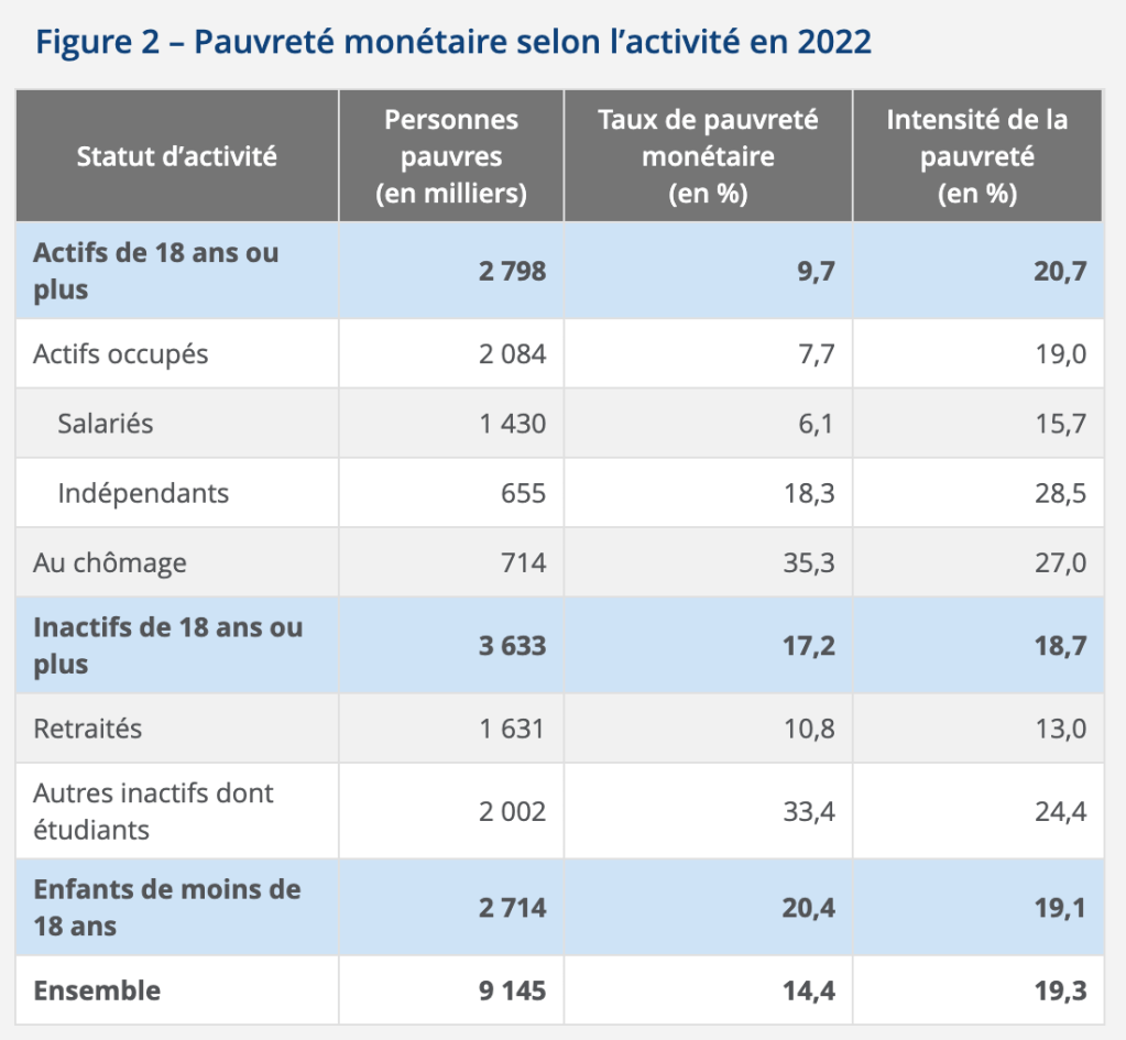 Le seuil de pauvreté (nombre de personnes pauvres/ensemble de la population) s’élève ainsi à 14,4%. La pauvreté touche ainsi 9,7% des actifs, catégorie qui regroupe les personnes en emploi et les demandeurs d’emploi. C’est 7,7% des travailleurs qui sont pauvres et 35% des chômeurs. Côté inactifs, les étudiants sont les plus touchés (33%) contre 10% pour les retraités. Cependant, le taux de pauvreté parmi les retraités est en forte hausse, plus 14% par rapport à 2017. Les nouvelles cohortes de retraités ont en effet eu des carrières plus hachées, marquées par le chômage et des modalités de calcul de leurs pensions moins favorables.
