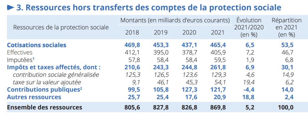 La majorité des ressources repose principalement sur le travail, via les cotisations sociales, appelées également charges sociales. Ces cotisations sociales (versements obligatoires effectués par les employeurs et les salariés, ainsi que les non-salariés pour acquérir des droits à des prestations sociales) représentent 61% des ressources de la protection sociale (61%) mais en diminution. A ceci s’ajoute les ITAF (impôt et taxe affecté) comme la CSG/RDS, les taxes sur l’alcool et le tabac, mais aussi les contributions publiques de l’État et des collectivités locales en financement des dépenses de solidarité (ex. : revenu de solidarité active, Fonds de solidarité vieillesse), d’une partie des exonérations de cotisations employeurs pour les bas salaires…