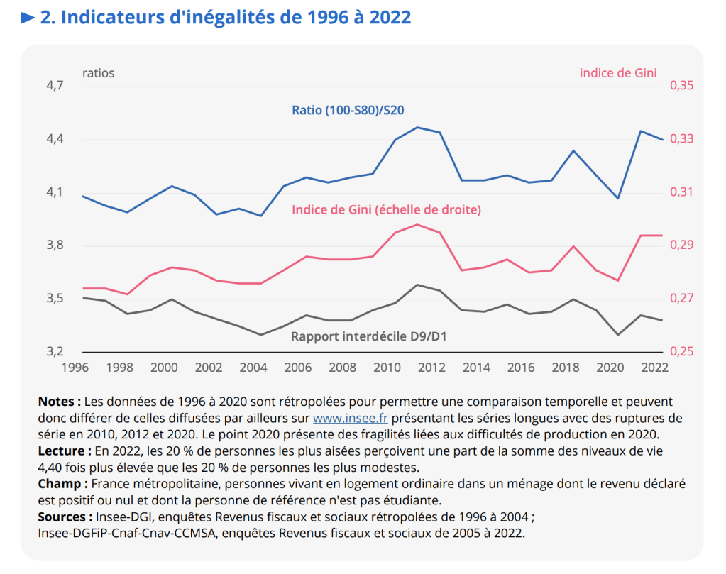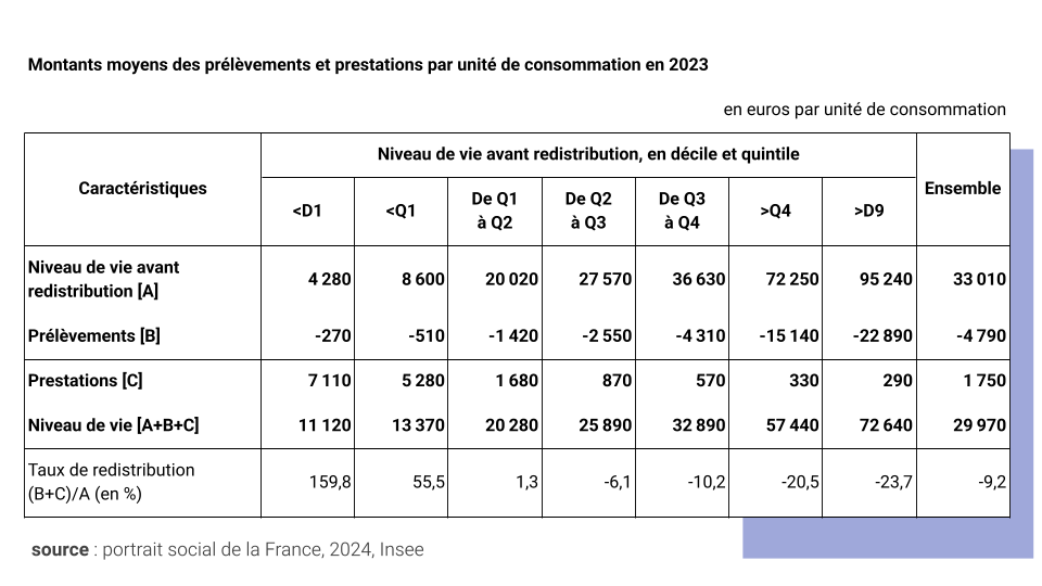 Le rapport entre les 20% les plus riches et les 20% les plus pauvres est de 8,4 avant redistribution, puis de 4,29 après redistribution.