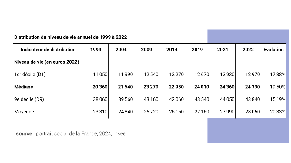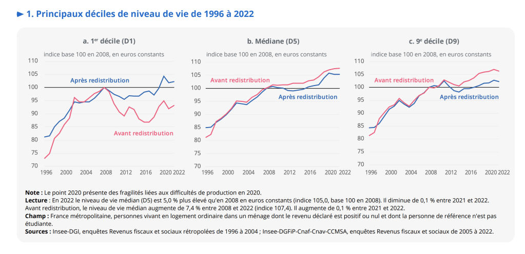 Les revenus de D9 augmentent de 15% sur la période, contre 17% pour D1 (soit les 10% les plus pauvres). Cependant, le gain pour D1 n’est que de 1900€ annuel en 20 ans, contre 5800€ pour les plus riches.