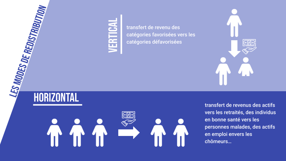 La conséquence de ces deux dispositifs est le transfert de revenus d’une catégorie d’individus envers une autre. On distingue dans ce cas la redistribution verticale (transfert de revenu des catégories favorisées vers les catégories défavorisées) de la redistribution horizontale (transfert de revenus des actifs vers les retraités, des individus en bonne santé vers les personnes malades, des actifs en emploi envers les chômeurs…).
