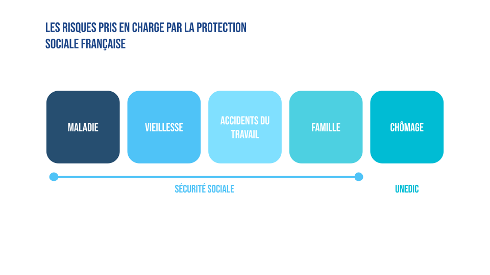 La protection sociale française regroupe la sécurité sociale et l’assurance chômage. Elle fournit une protection contre les risques suivants