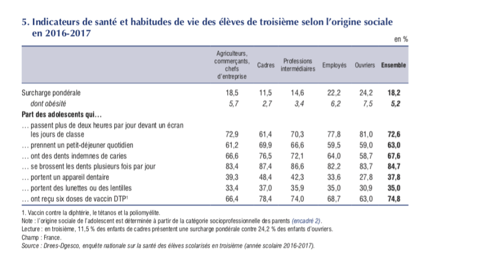 De même, les catégories les plus défavorisées sont davantage sujettes à l’obésité, aux problèmes dentaires faute d’accès à des activités sportives, une alimentation de moins bonne qualité et un accès au soin moindre (désert médical qu’il soit en zone urbaine sensible ou en milieu rural, dépassement d’honoraires, pas de mutuelle…)
