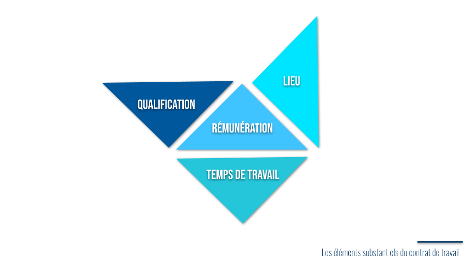 Le pouvoir de direction ne peut modifier cependant les éléments substantiels du contrat de travail, c’est-à-dire des éléments qui ont déterminé le consentement du salarié lors de la conclusion du contrat de travail. Il s’agit ici de la qualification (type de poste), de la rémunération, de la durée et du lieu habituel de travail (en l’absence de clause de mobilité).
