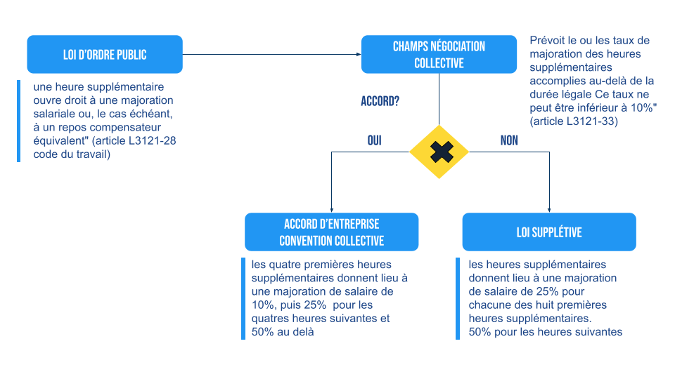 Ainsi par exemple pour la rémunération des heures supplémentaires. La loi pose le principe d’une rémunération supérieure. (principe d’ordre public). Concernant le montant de cette majoration, elle va laisser la négociation collective décider de ce montant, en indiquant une majoration minimale de 10%. En cas d’absence d’accord, la majoration de la rémunération des heures supplémentaires sera de 25%. Les entreprises ont donc intérêt à signer un accord pour une majoration à 10%, ou 15%.